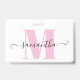 A bold light pink monogram with white polka dots paired with a cute curly swash signature name for employee badges.