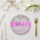 Girly pastel lilac shimmer bokeh glitter sparkles monogram name and initial paper plate. Your custom name and monogram are written in an elegant hand lettered script with a pink background.