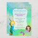 Colourful birthday / pool party invitation done in graphics of a mermaid scale background and cute graphics of two mermaids. Personalize this fun girly invitation to suit your party needs.