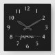 Girly Simple Minimalist Black Monogram Name Script Custom Personalized Square Wall Clock. These design featuring your first name in a pretty hand lettered style swash tail font signature typography white script on black colour background. These are easy to customize it. Great stylish feminine housewarming gift, also for birthday, wedding, bridal shower, mother’s day, sweet 16 birthday party and baby shower, graduation and It’s for the girl who loves unique sparkle stylish things.