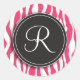 This adorable stickers feature a pink & white zebra print background. On top is a dark grey circle with a white border. Customize the letter inside the circle to personalize the product.