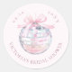 Girly bridal shower round sticker featuring a shiny disco ball with a light pink bow and elegant fonts in which all your personalized information is written. You can find matching products from this collection in our store.