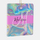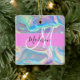 Girly pink, peach and aqua holographic iridescent monogram name and initial ceramic ornament. Your custom name and monogram are written in an elegant hand lettered script with a pink background. A perfect birthday or Christmas gift!