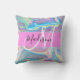 Girly pink, peach and aqua holographic iridescent monogram name and initial throw pillow. Your custom name and monogram are written in an elegant hand lettered script with a pink background. A perfect birthday or Christmas gift!