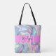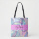 Girly pink, aqua and turquoise holographic iridescent monogram name and initial tote bag. Your custom name and monogram are written in an elegant hand lettered script with a pink background. A perfect birthday or Christmas gift!