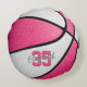 This personalized girls' basketball pillow features the realistic image of a basketball that has alternating pink and white recolored panels - personalize with player name in an "autograph" style font overlying the athlete's jersey number - by katz_d_zynes
