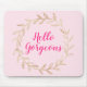 Girly and pretty blush pink gold wreath mouse pad featuring the words "Hello Gorgeous" in an elegant hot pink script.
