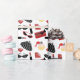 Wrapping paper featuring a girly red themed pattern of purses, perfume, rubies, lipstick, and sunglasses.