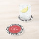 This coaster features a black & white zebra print background. On top is a red circle with a white border. Customize the letter inside the circle to personalize the product.