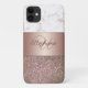 This girly faux glitter phone case will have your phone protected in style. This trendy design features textures of rose gold and white marble, rose gold faux metallic texture and faux rose gold glitter. Atop the rose gold metallic centre is a monogrammed initial in script typography with a name in dark rose gold to personalize. Makes a unique girly gift for any special occasion. Designed by artist ©Susan Coffey.