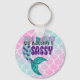 Girly and glam Splashy Sassy purple and green glitter mermaid tail keychain with a pink and turquoise mermaid scales background.
