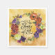 Thanksgiving napkins depict beautiful rustic autumn watercolor floral purple, burnt orange, blue and yellow flowers and greenery. If features a portion of Bible Verse Psalm 136:1, "Give thanks to the LORD, for he is good. His love endures forever." _