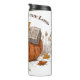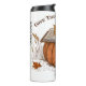 This tranquil graphic features a large pumpkin with an open Bible resting on top, adorned with a single autumn leaf. The design includes the phrase 'Give thanks to the Lord' and the reference 'Psalm 107:1,' beautifully blending a message of faith with a seasonal theme.