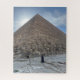 Sun shining behind the Giza Pyramid. The giant pyramid overshadows the man walking by.