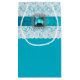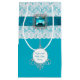 Elegant aqua blue gift bag, with graphics of a white lace look, across the top of the bag. Real looking graphics of a aqua blue satin ribbon, runs through the middle of the lace top, with a silver tone and aquamarine looking gem jewel. A metallic looking ornament style tag, looks like it is hanging down, and has custom text. Personalize the text to read what you want. Matching tissue paper available.