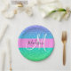 Girly and glam blue, green, aqua and turquoise mermaid glitter sparkles gradient monogram name and initial paper plate. Your custom name and monogram are written in an elegant hand lettered script with a pink background.