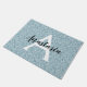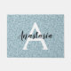 Girly and glam light blue silver glitter sparkles monogram name and initial doormat. Personalize with your custom name in an elegant black script and your monogram initial in white. You can even change the text colour and font style and size using the customize option!