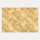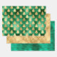 This glam holiday wrapping paper assortment features a pattern of gold faux foil Christmas trees on a green faux foil background; a gold faux foil art deco fan pattern; and an emerald green satin faux foil stripe pattern.