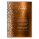 The left-hand edge of this elegant modern wedding table number card features a faux diamond glitter border. The word "table" and the table number appear in white handwriting script on a copper faux brushed metal background. Add the names of your guests who are assigned to each table.