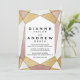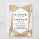 This glam geometric diamond wedding invitation card is perfect for a modern wedding. The design features a hexagon geometric pattern with faux gold glitter, faux rose gold foil, and faux marble texture decorating the spaces in the pattern.