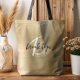 This elegant personalized tote bag features a monogram and first name in modern black and white script on a glam gold brushed metal background.