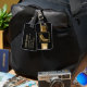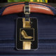 Glam luggage tag done in black with graphics of gold paint brush strokes and glitter, with a golden pair of stiletto high heels decorating the front. Personalize the text fields, on the back of the tag, to suit your needs.