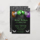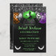Elegant green, orange, purple and black baubles ornaments with skulls, witch, bats and stripes patters, with dripping glitter and black foil background with silver cobweb corners and bats