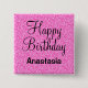 Personalized girly and glam Happy Birthday button with a hot pink glitter sparkle background and elegant black writing. You can easily add the name of your choice and change the colour and font of the name using the customize option!