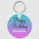 Personalized girly and glam Happy Birthday keychain with a bright, colourful pink/ blue/ turquoise/ aqua/ lilac/ purple glitter sparkles ombre background and elegant black and white writing. You can easily add the name of your choice and change the colour and font of the name using the customize option!