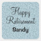 Personalized glam Happy Retirement square sticker with a light blue silver glitter sparkles background and elegant black writing. You can easily add the name of your choice and change the colour and font of the name using the customize option!