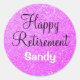 Personalized glam Happy Retirement classic round sticker with a purple glitter sparkle background and black and white writing. You can easily add the name of your choice and change the colour and font of the name using the customize option!