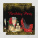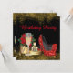 Red black and gold high heel shoe birthday party invitation with elegant red high heel shoes, gift box, pearls and champagne glass on a beautiful black glitter background. You can easily customize this elegant red black and gold birthday party invitation for your event by simply adding your details in the font style and colour, and wording of your choice. You can also change the background colour. This is a printed design with no real diamonds, jewels, glitter, etc.