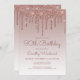 This trendy 90th birthday invitation features a sparkly rose gold faux glitter drip border and ombre background. The words "90th Birthday" and the name of the guest of honor appear in dark rose casual handwriting script, with the rest of the customizable text in sans serif font. The same rose gold glitter drip design appears on the reverse side. Easily edit the text for any age birthday.