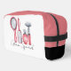 The Glam Squad  is here; featured on this travel bag. This fun design has a hair brush, mirror, perfume and makeup brush. The top and side panels are a soft salmon pink, with black at the bottom. This bag is great for travel or the gym. It also makes a great gift.