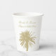 Glamourous beach wedding party supplies custom Paper Cups. Exotic design template with tropical palm tree silhouette. Personalize with names of bride and groom plus date of marriage. Part of beautiful matching theme involving royal table decoration and formal stationery. Beige sand colour palette HEX code #C2B280. Disposable cups for hot and cold drinks.