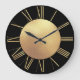 This elegant and glamourous wall clock features a black and gold theme. The centre features a faux metallic style gold foil. The outer frame is a solid black. The hours are printed as Roman numerals in a shiny looking gold foil.