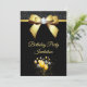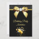 Beautiful elegant any age birthday party invitation for women, with printed images of a glamourous gold bow with a rhinestone diamond gem in the centre and a gold ribbon on a sparkly black glitter, and plain black background, with a bunch of gold and black balloons surrounded by stars. The reverse has a pretty gold pearl mat to encase your event details with 2 glasses of champagne with gold bows at the bottom all printed on a plain black background. All text is fully customizable to meet your requirements. Text colour can be changed. If you would like help to customize your product or would like matching products please contact me through my store and i will be very happy to help you. Pearl mat by ©Hazel Kinvig-Paul www.design-a-dream.co.uk