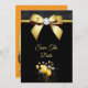 Beautiful elegant any age birthday party Save The Date for women, with printed images of a glamourous gold bow with a rhinestone diamond gem in the centre and a gold ribbon on a sparkly black glitter, and plain black background, with a bunch of gold and black balloons surrounded by stars. The reverse has a pretty gold pearl mat to encase your event details with 2 glasses of champagne with gold bows at the bottom all printed on a plain orange background. All text is fully customisable to meet your requirements. Text colour can be changed. If you would like help to customise your product or would like matching products please contact me through my store and i will be very happy to help you. Pearl mat by ©Hazel Kinvig-Paul www.design-a-dream.co.uk