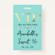 This glamourous VIP all access pass badge features a sparkly, feminine design on a soft teal coloured background. The VIP title is printed in a gold foil style font, followed by the event title. A band of diamonds separates the text. The party or event location and time are printed on the back. It's perfect for a birthday party, sweet 16, bridal shower, or other elegant celebration.