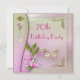 Womens' beautiful 70th birthday party invitations. Elegant and glamourous modern pink, gold and green invites with pretty pink magnolia flowers, a stylish, romantic heart shaped printed key, cute butterfly and pretty, ornate gold swirls and flourishes and trendy art deco style font. These chic, classy, fashionable girly invitations are decorated on both sides and have a pretty flat printed mother of pearl effect. PLEASE NOTE: All products on Zazzle have flat printed images. Text, font and colour of font are all customizable. You can also choose the type of paper you would like your invites to be printed on. If you need assistance customizing your product please contact me through my Groovy Graphics store and I will be very happy to help.