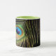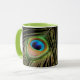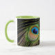 Stylish coffee mug with a glamourous peacock feather over black background.