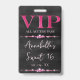 This glamourous VIP all access pass badge features a sparkly, feminine design on a black background. The VIP title is printed in a pink foil style font, followed by the event title. Strings of pink diamonds separates the text. The party or event location and time are printed on the back. It's perfect for a birthday party, sweet 16, bridal shower, or other elegant celebration.