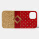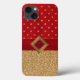 Glamourous iPhone case done in graphics of gold glitter, across the bottom half and a red with gold glitter dots, on the top half. A red ribbon runs across the middle with chic graphics of a ruby set in a gold diamond shaped setting. Gorgeous phone case.