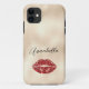 This glamourous and girly custom phone case features a champagne gold foil background. An image of bright red glitter lips is placed in the centre. A sample name is printed above the lips in an elegant script font. Your can personalize the phone case and to add your own custom name or text.