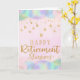 A glamourous retirement card. This beautiful Glam card features gold stars and pastel iridescent balloons. A lovely stylish card to say congratulations or goodbye to an employee, family or friend who is retiring. Personalize with a name and add to or amend the message inside which currently reads " Happy retirement. Wishing you all the best in your new retired life."