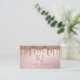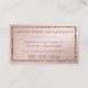 This stylish business card features a glamourous, girly, rose gold coloured background with a foil texture design. Glitter sequins are dripping across the top portion. Monogram initials are placed beneath the glitter, followed by a sample name printed in an elegant script font. The back of the business card features the contact information with a rose gold glitter frame.