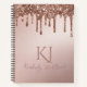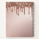 This stylish custom notebook features a glamourous, girly, rose gold coloured background with a foil texture design. Glitter sequins are dripping across the top portion. Monogram initials are placed beneath the glitter, followed by a sample name printed in an elegant script font. The back of the notebook features a matching rose gold background with glitter drips.