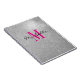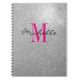 Glamourous silver glitter monogram spiral notebook. Monogrammed office and school supplies with faux silvery texture. Add your own classy name initial letter. Elegant script typography. Chic metallic design for writing down notes, office work, wedding planning and more. Neon pink and black logo with sparkly sparkles and glittery glimmers background.