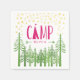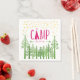 A rustic yet chic personalized sticker for a "Glamping" themed party complete with a tent in a forest of trees under faux foil gold stars.