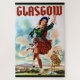Great travel poster for Glasgow Scotland featuring a Scots lassie in a kilt dancing to a bagpiper.